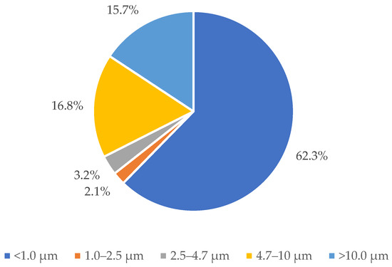 The mass size distribution of dust particles was measured by DustTrak, and the results are shown in Figure 4. With a proportion of 62.3%, the majority of dust particles were less than 1 µm in size. The rest of the dust particles had size ranges of 1.0–2.5 µm, 2.5–4.7 µm, 4.7–10.0 µm, and larger than 10.0 µm, with proportions of 2.1%, 3.2%, 16.8%, and 15.7%, respectively. As shown in Table 1 and Figure 4, although most dust particles were smaller than 1 µm, the size distribution of bacteria attached to dust particles was mainly larger than 2.1 µm. This demonstrated that most airborne E. coli are associated with dust particles greater than 2.1 µm in size. It can be explained by shielding effect [22]. In a previous study [22], authors mentioned that the virus associated with bigger particles may be more protected from changes in the ambient environment than viruses that live as a singlet or bind to smaller particles. Thus, E. coli in this study may be shielded from environmental ambient when carried by large particles. Small particles had less of a protective impact on bacteria adhering to them. This could be one reason of the quick death of airborne E. coli.