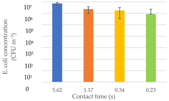 The contact time affected the concentration of viable E. coli. As the wind speed increased, the contact time decreased. Additionally, when contact time decreased, the concentration of E. coli in the system also decreased as shown in Figure 5. This was consistent with the real situations in the poultry house. When wind speed increases, the concentration of dust particles and pathogens decreases [23].