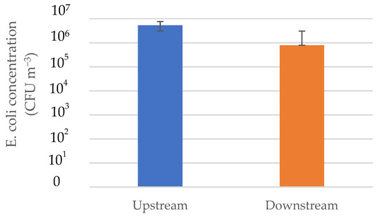 The physical loss was calculated by comparing the concentrations (Table S1) in the upstream and downstream chambers. In this system, the physical loss of E. coli was approximately 83% or 0.8 log10 reduction. The physical loss of the testing system is shown in Figure 6.