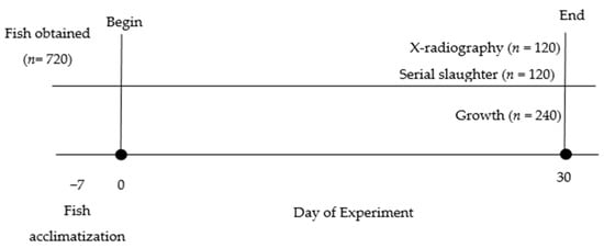 Experiment timeline, where groupers were obtained and acclimatized for 7 days (Day 7), before being distributed to the experimental tank on Day 0. Groupers were distributed evenly among four treatment groups (28, 30, 32, and 34 °C) and among 3 tanks within each group, for a total of 12 tanks. Groupers were cultured for 30 days before growth was measured. Overall, 5 groupers from each tank were removed for X-radiography (5 fish × 3 replicates × 4 temperatures × 2 diets = 120) and serial slaughter experiment (5 fish × 3 replicates × 4 temperatures × 2 diets = 120) while 10 groupers (10 fish × 3 replicates × 4 temperatures × 2 diets = 240) were obtained from each tank for the growth study.