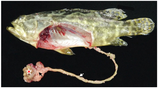 Elementary tract of hybrid Sabah grouper. Star denotes a stomach filled with feed, black arrow indicates pyloric caeca, and white arrow indicate intestine.