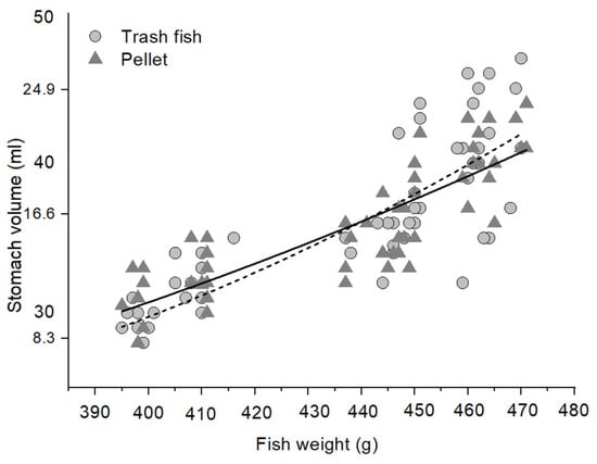 Relationship between stomach volume (mL) and fish weight (g, wet weight) of the adult hybrid Sabah grouper fed, fitted with the allometric model both in pellet and trash fish diets. For the pellet diet, the equation of stomach volume was 0.001 W1.724 (chi-square = 4.698; r2 = 0.72). Meanwhile, for the trash fish diet, the equation of stomach volume was 0.0002 W2.12 (chi-square = 3.424; r2 = 0.84).
