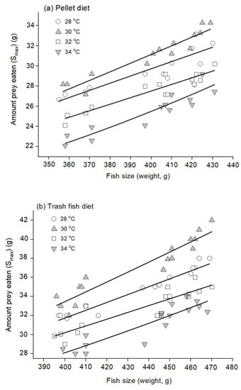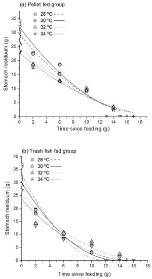 Similarly, Pirhonen et al. [24] reported that the stomach volume is directly proportional to the weight of fish. A previous study noted that the number of satiations decreases as the bodyweight decreases, suggesting that smaller fish eat relatively higher amounts of food than larger fish [25]. In all cases, the hybrid Sabah groupers consumed more trash fish than pelleted feed. The pellet feed is compact and has an artificial flavor, which may induce reluctance to eat, whereas trash fishes are natural and soft and therefore more appealing. The hybrid Sabah groupers ate more at 28 °C and 30 °C, than at 32 °C and 34 °C, indicating that the 28 °C–30 °C temperature range is favorable for these fish.