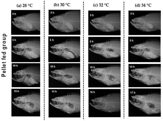 X-radiography observations (Figure 5 and Figure 6) indicate the food route in the alimentary tract. GET was shortened when the temperature rose from 28 to 30 °C. However, GET increased when the temperature rose beyond 30 °C to 34 °C. GET was quicker in hybrid Sabah groupers fed with trash fish than in pellet diets at all temperatures. X-ray images showed that the food had completely left the digestive tract (tubular structure consist of four parts: oral cavity; initial region with an esophagus; stomach and pylorus; a medium portion of longer length comprises of pyloric blind; and a terminal region that ends with the anus) after 15 h (28 °C), 13 h (30 °C), 16 h (32 °C), and 17 h (34 °C) after the pellet diet was given (Figure 5, Supplementary Materials Figure S1), as well as after 14 h (28 °C), 12 h (30 °C), 15 h (32 °C), and 16 h (34 °C) after the trash fish diet was fed (Figure 5, Supplementary Materials Figure S2). The shortest GET was marked in the hybrid Sabah grouper cultured at 30 °C and fed with trash fish (Figure 6).