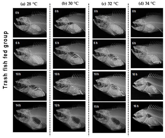 Movement of radio-opaque barium sulphate (BaSO4) along the alimentary tract of adult hybrid Sabah grouper. Each panel shows the passage of ingested BaSO4-treated trash fish food through the alimentary tract of the hybrid Sabah group at (a–d). Five fish were used for each sampling point and temperature. Only images with remarkable movement are shown.