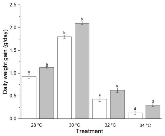 Daily weight gain of hybrid Sabah grouper in treatments at different temperatures and fed for 30 days. White bar represented pellet while gray bar represented trash fish. Different letters indicated significant differences among treatments (p < 0.05).