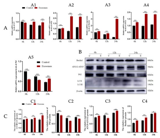 Yak follicular fluid exosomes labeled with PKH-26 were incubated with YCCs for 6, 12, and 24 h. PKH-26-labeled exosomes showed a significant increase in fluorescence intensity when compared to the other groups. The results indicate that most of the cells took up the exosomes at 24 h. In contrast, the control group showed no intracellular red fluorescence in vitro. These results suggest that the yak follicular fluid exosomes can be internalized by YCCs (Figure 2). To detect whether autophagy activation occurred in YCCs treated with yak follicular fluid exosomes, we assessed the levels of autophagy-related genes at 6, 12, and 24 h using RT-qPCR. Compared to the control group, the LC3 level increased in the exosome group (Figure 3A1). The same trend was also found for ATG5, Beclin-1, and ATG12 (Figure 3A2–A4), but the variation in the expression of p62 was in the opposite direction (Figure 3A5). The above RT-qPCR data suggest that yak follicular fluid exosomes could upregulate autophagy at the mRNA level.