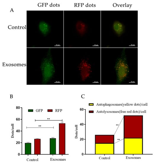 Further WB results showed that in the exosome groups, protein expression was positively correlated with YCC autophagy, as LC3-II, ATG12-ATG5, and Beclin1 were increased (Figure 3C1,C3,C4). In contrast, P62 expression was decreased (Figure 3C2). Furthermore, YCCs were transfected with RFPGFP-LC3 virus. For the control group, no exosomes were added and the experimental group was cultured with yak follicular fluid exosomes for real-time monitoring of the autophagy flow. RFP was used to label and track LC3, and the weaking of GFP can indicate the fusion of lysosomes and autophagosomes to form autophagosomes. Specifically, the GFP fluorescent protein is sensitive to acidity, whereas the RFP fluorescence signal can persist. In the merged images, yellow dots indicate autophagosomes while free red dots indicate autolysosomes. An increase in both yellow and red dots in YCCs means that the autophagic flux has increased. In this study, we observed more GFP and RFP dots in the yak follicular fluid exosome groups than the control (Figure 4A,B). The quantitative results showed that the yak follicular exosomes also had significantly increased numbers of both yellow (autophagosomes) and red dots (autolysosomes) (Figure 4C). These results indicate much higher amounts of autophagosomes in YCCs treated with yak follicular fluid exosomes. Taken together, these data suggest that the presence of yak follicular fluid exosomes promotes autophagy.