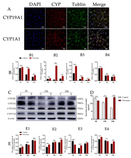 CYP17A1 and CYP19A are essential mammal steroidogenic enzymes. CYP17A1 catalyzes a reaction leading to the formation of androstenedione from pregnenolone while CYP19A catalyzes a reaction leading to the formation of estradiol from androstenedione [24]. CYP1A1 and CYP1B1 thus catalyze two reactions that lead to the formation of 2-OHE2 (which is approximately 50% of this process) and 4-OHE2 from estradiol. To test whether yak follicular fluid exosomes affect 2-OHE2 secretion from YCCs, we observed the expression of CYP19A1 and CYP1A1 using immunofluorescence staining (Figure 5A). We then detected the mRNA expression levels for CYP17A1, CYP19A1, CYP1A1, and CYP1B1 in YCCs and found that CYP17A1, CYP19A1, and CYP1A1 were all increased in the exosome groups when compared with the control (Figure 5B1–B3), but the variation in expression of CYP1B1 was decreased and there was no significant difference between the yak follicular fluid exosomes and control groups (Figure 5B4), suggesting that 2-OHE2 secretion may be promoted by yak follicular fluid exosomes. Subsequently, to further confirm these results, WB assays were performed, and the protein expression levels showed the same trend as mRNA (Figure 5C,E). The ELISA results also consistently revealed that estradiol secretion was promoted in yak follicular fluid exosome groups, which was indicated by the upregulation of E2 in the YCC supernatant (Figure 5D). The data thus demonstrate that the yak follicular fluid exosome treatment promoted estradiol secretion and the estradiol metabolites were predominately 2-OHE2 and not 4-OHE2 in YCCs.