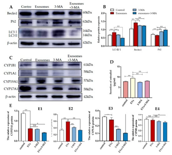 3-MA inhibits autophagy and reduces 2-OHE2 secretion in YCCs. (A,B) Western blot analysis of protein expression in YCCs. (C) Western blot analysis of the protein expression in YCCs (See Figure S3). (D) ELISA kit analysis of the concentrations of estradiol (pg/mL) in the cell supernatant. (E) Quantitative Western blot results for CYP17A1 (E1), CYP19A1 (E2), CYP1A1 (E3) and CYP1B1 (E4). Data are expressed as the mean ± SD. n = 4. NS means no significant difference. * p < 0.05 and ** p < 0.01 indicate significant differences between the yak follicular fluid exosome treatments and the control.
