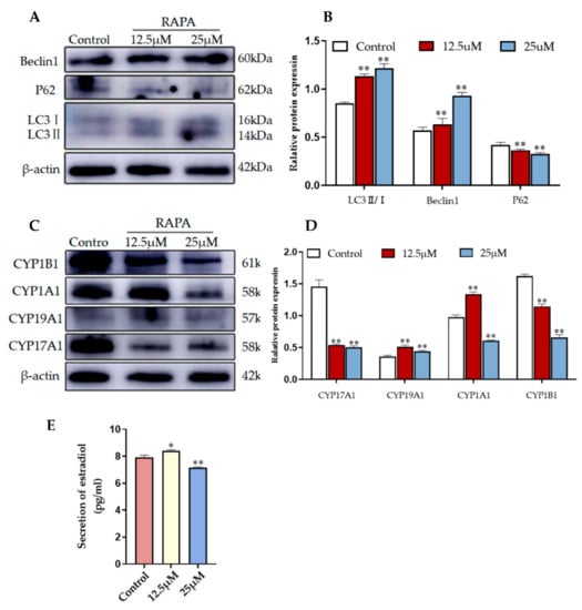 The pharmacological agent RAPA activates autophagy by blocking MAPK/JNK-MTORC1 signaling [25]. To determine whether 2-OHE2 secretion is related to autophagy activation, we treated YCCs with different concentrations of rapamycin. The WB results consistently reveal that compared with the control group (no RAPA added), autophagy was promoted by rapamycin-treated YCCs, which is indicated by the upregulation of LC3 and Beclin1 and the downregulation of P62 (Figure 7A,B). Furthermore, the WB results show that the expression levels of CYP19A1 and CYP1A1 were increased whereas CYP17A1 and CYP1B1 were decreased when compared with the control (Figure 7C,D). An ELISA assay was performed to assess the estradiol in the cell supernatant, and the results show that the rapamycin treatment effectively increased estradiol secretion (Figure 7E). Thus, RAPA stimulation induced 2-OHE2 secretion from YCCs by activating autophagy. Taken together, the data demonstrate that YCCs treated with yak follicular fluid exosomes showed similar increases in 2-OHE2 secretion through the activation of autophagy in cumulus cells treated with Rapa.