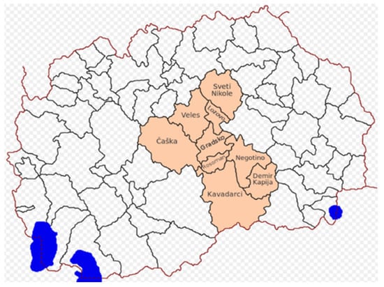 The VPR region in North Macedonia faces similar challenges related to stray dogs. The VPR consists of nine municipalities, as shown in Figure 1: Veles, Negotino, Sveti Nikole, Čaška, Demir Kapija, Lozovo, Gradsko, Kavadarci, and Rosoman. The region covers an area of 4042 km2, and according to the results of the 2002 census, it has 154,603 inhabitants.
