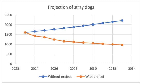 The projection of the number of stray dogs in the Vardar region, whereby this projection takes into account the following assumptions: dog mortality rates (7% per year according to the average life expectancy of 14 years for certain dog breeds [60,61], dog birth rates (30% without project implementation; 15% with project implementation), and projected adoption and euthanasia rates of dogs (20% total for both categories) in the existing shelters and the new shelter. According to the stated assumptions, we provide a projection of the number of stray dogs “with” and “without” the project;