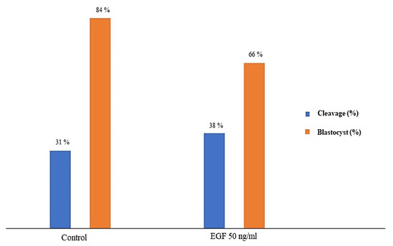 EGF at a concentration of 50 ng/mL EGF was chosen to test the effect of EGF-treated semen on the fertilizing potential of in vitro-produced embryos. A total of 338 cumulus-oocyte complexes (COCs) were cultured in vitro. Among these, 173 were fertilized with EGF-extended semen, whereas 165 formed the control group. The number of cleaved zygotes was 51 (31%) in the control group and 65 (38%) in the EGF-treated group. The number of blastocysts was 43 (84% from the cleaved zygotes) in the control group and 43 (66 % from the cleaved zygotes) in the EGF-treated group. As shown in Figure 1, no difference was found between the two experimental groups in cleavage and blastocyst formation rates (p > 0.05).