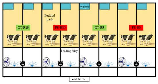 In the R10 cooling system, the animals reduced their DM intake to reduce the adverse effects of heat, and consequently, lower nutrient volumes were available for milk synthesis, which was reflected in the production efficiency. Similar findings were reported by authors when comparing the DM intake, productivity, and feed efficiency of cows under thermoneutral conditions vs. heat stress conditions [