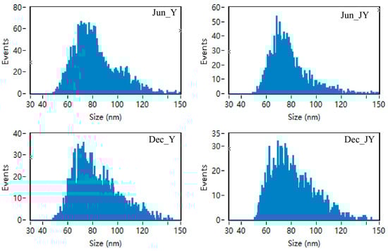 Range of milk exosomes particle sizes for yak and Jeryak milk collected in June and December.