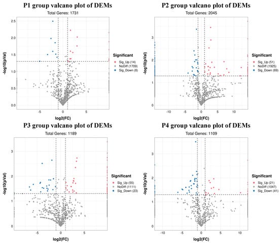 A total of 22 DEMs were identified in group P1, of which 14 were upregulated and 8 were downregulated. A total of 120 DEMs were identified in group P2, of which 51 were upregulated and 69 were downregulated. In group P3, 78 DEMs were identified, of which 55 were upregulated and 23 were downregulated. In group P4, 62 DEMs were identified (21 upregulated and 41 downregulated DEMs). (Supplementary Materials, Table S2). The volcano plots of all four groups are shown in Figure 3. The heat map of DEMs of all four groups are shown in sup-plementary materials, Figure S2.