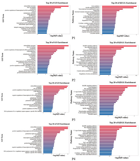 To further investigate the biological functions regulated by the DEMs, the target genes of the significantly DEMs were predicted separately using TargetScan and Miranda. The intersection of the two software was taken as the final list of target genes. The results of the top 20 enriched GO terms and KEGG pathways showed that the four groups were mainly enriched for extracellular exosome, zinc ion binding, cytoplasm, etc. KEGG functional analysis of the identified target genes showed that they were mainly enriched in Axon guidance, MAPK signaling pathway, and Ras signaling pathway, etc. (Figure 4).