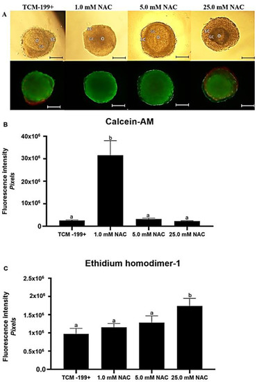 Morphology of secondary follicles after culturing in the different treatments (A). Staining intensity (mean ± SEM) for calcein-AM (B) and ethidium homodimer-1 (C) in bovine secondary follicles after 18 days of culturing in TCM-199+ alone or with different concentrations of NAC (1.0, 5.0, and 25.0 mM). Lower case letter “a, b” represent significant differences between treatments (p < 0.05). O: oocyte, SC: stromal cells, GC: granulosa cells. Scale bar: 100 µm.
