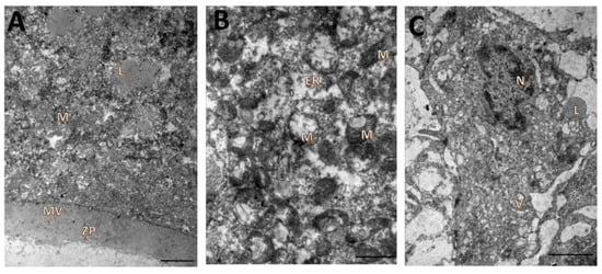 Ultrastructural characteristics of oocytes (A,B) and granulosa cells (C) from uncultured secondary follicles. Mitochondria (M), zona pellucida (ZP), nucleus (N), lipid droplets (L), vacuoles (V), microvillous (MV), endoplasmic reticulum (ER). Scale bar = 100 µm.