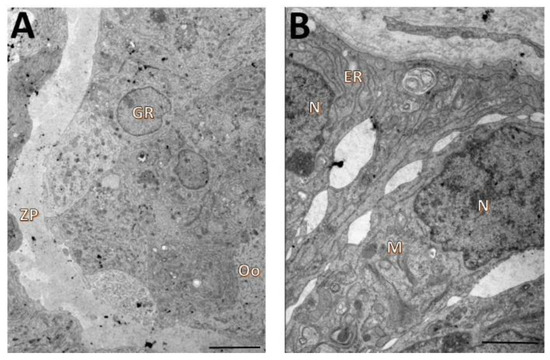 Ultrastructural characteristics of oocytes (A) and granulosa cells (B) from secondary follicles after 18 days of in vitro culturing in TCM 199+ supplemented with 5 mM NAC. Ooplasm (Oo), mitochondria (M), zona pellucida (ZP), nucleus (N), endoplasmic reticulum (ER), granulosa cells (GR). Scale bar: 100 µm.
