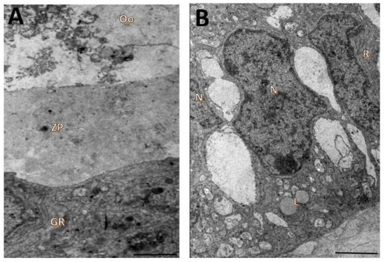 Ultrastructural characteristics of oocytes (A) and granulosa cells (B) from secondary follicles after 18 days of in vitro culturing in TCM 199+ supplemented with 25 mM NAC. Ooplasm (Oo), zona pellucida (ZP), nucleus (N), lipid droplets (L), granulosa cells (GR). Scale bar: 100 µm.