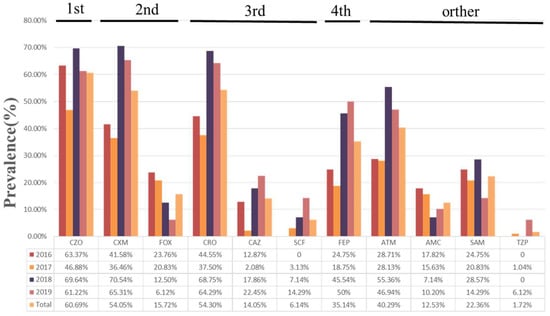 During 2016–2019, 407 E. coli strains were obtained using cloacae swabs from chickens in central China and 64.37% (262/407) were ESBL producers (Table 2), with 63.37% (64/101) in 2016, 60.42% (58/96) in 2017, 66.07% (74/112) in 2018, and 67.35% (66/98) in 2019. The isolation rate of ESBL producers increased each year, except in 2017.
