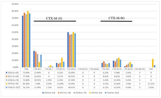Among the 262 ESBL-positive isolates, all isolates were positive for ESBL genes, thereby indicating the high sensitivity of the phenotypic tests (Table 3). Among the ESBL-positive isolates, blaCTX-M genes were detected in 97.33% (255/262) of the isolates and blaTEM genes were detected in 76.72% (201/262) of the isolates. However, blaSHV genes had the lowest detection rate of (3.05%) 8/262, and they were only detected in 2019. In addition, the most common ESBL genotype combination in E. coli was blaTEM + blaCTX-M (194/262, 74.46%), and the rate increased steadily (Table 3). By contrast, the detection rates for blaTEM (7/262, 2.67%) and blaCTX-M (53/262, 20.23%) alone decreased slowly. Furthermore, the CTX-M genotypes include several variants (CTX-M-1, CTX-M-2, CTX-M-8, CTX-M-9, and CTX-M-25) but only two CTX-M genotypes (CTX-M-1G, 75.57%; CTX-M-9G, 21.76%) were detected in the isolates (Figure 2). The predominant specific CTX-M types were CTX-M-55 (48.47%) and CTX-M-1 (17.94%), followed by CTX-M-14 (11.01%), CTX-M-15 (8.02%), CTX-M-9 (6.11%), CTX-M-65 (4.58%), and CTX-M-3 (1.15%). It should be noted that the rate of CTX-M-14, CTX-M-15, CTX-M-65, and CTX-M-3 detection increased each year. Moreover, some new combinations of ESBL genotypes were developed in the last two years, including CTX-M-3/TEM-1, CTX-M-15/TEM-30, CTX-M-15/SHV-12, CTX-M-55/SHV-12, and CTX-M-65/SHV-12.