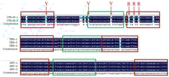 Primer sequences used for detecting blaCTX-M, blaSHV, and blaTEM genes.