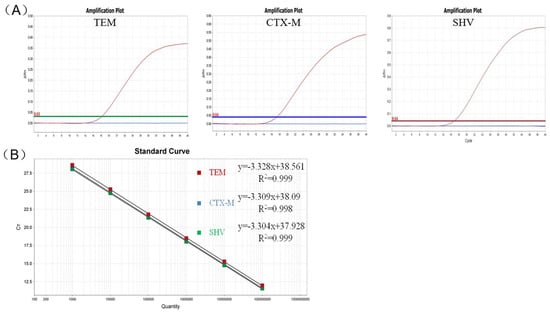 The detection targets were cloned into the pMD18-T vector and the concentrations of pMD-CTX-M, pMD-TEM, and pMD-SHV were determined using a NanoDrop One/OneC spectrophotometer (Thermo, Waltham, MA, USA). Sensitivity and standard curve tests were conducted using a 10-fold dilution series of the recombinant plasmids. Nuclease-free H2O was used as the negative control. Sensitivity tests were performed under the optimized reaction conditions and the results were compared to the PCR results. Standard curves were also established.