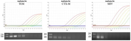 In the qPCR sensitivity tests, the detection limits for blaCTX-M, blaTEM, and blaSHV were determined as 2.06 × 101 copies/μL, 1.10 × 101 copies/μL, and 1.86 × 101 copies/μL in a single-tube assay system, respectively, and the limits were 2.06 × 103 copies/μL, 1.10 × 103 copies/μL, and 1.86 × 104 copies/μL in the PCR sensitivity tests (Figure 5). Thus, the sensitivity of the new method was at least 100 times that of the PCR assays. Using the standard curves established for the three ESBL genes (Figure 4B), three linear relationships were obtained between the copy number (x-axis) and quantification cycle (Cq) value (y axis) as follows: y = −3.328x + 38.561, R2 = 0.999 for blaTEM; y = −3.309x + 38.09, R2 = 0.998 for blaCTX-M; and y = −3.304x + 37.928, R2 = 0.999 for blaSHV.