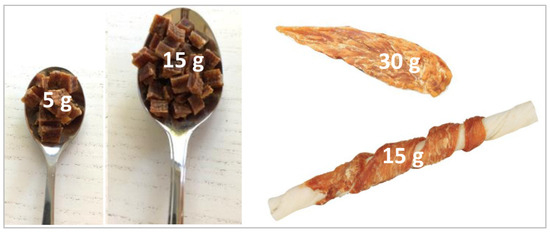 Medical records and laboratory results were reviewed, and owners answered a standardised questionnaire either in writing or through a telephone interview. The questionnaire detailed diet and treats, time of onset, clinical signs observed, disease development, treatment strategies, time to recovery (if achieved), any ongoing issues, and concurrent medical conditions and therapy. In order to quantify the amount of jerky treats ingested by the dogs, conversions of one teaspoon of small treats to 5 g, one tablespoon of small treats to 15 g, one filet to 30 g and the jerky part of one chew stick to 15 g were applied (Figure 1).