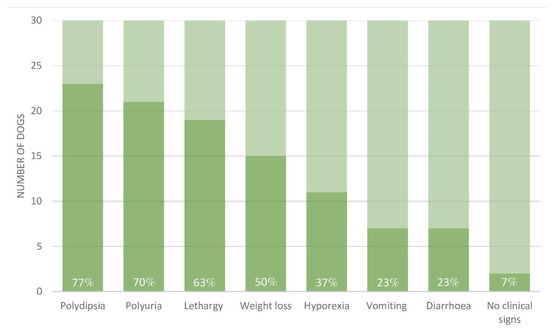 Clinical signs included polydipsia (23/30), polyuria (21/30), lethargy (19/30), weight loss (15/30), hyporexia (11/30), vomiting (7/30), and diarrhea (7/30). Two dogs showed no clinical signs (for further details see Figure 2).