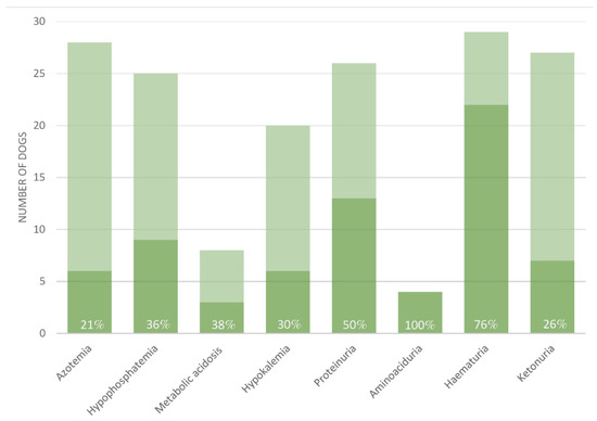 Para-clinical findings in 30 dogs diagnosed with jerky induced Fanconi syndrome. Para-clinical findings reported in medical records from attending veterinarians for 30 dogs diagnosed with acquired Fanconi syndrome associated with ingestion of jerky treats. All dogs were included due to confirmed normoglycemic/hypoglycemic glycosuria. The dark color represents the number of dogs reported positive for the finding in question. The total height of each bar represents the total number of dogs for which the specific para-clinical finding had been investigated. The white numbers provide the percentage of positive findings.