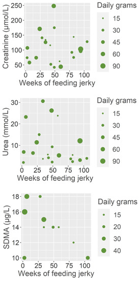 There was no association between the owner estimated daily jerky allowance and serum creatinine (p = 0.8), symmetric dimethylarginine (SDMA) (p = 0.8) or urea (p = 0.4) concentrations. Nor was there any association between duration of jerky feeding and serum creatinine (p = 0.9), and urea (p = 0.2) concentrations (Figure 4). For the serum SDMA fewer data were available (n = 10). However, while duration of jerky feeding was not significant when all the dogs with SDMA measured at the time of diagnosis were included (p = 0.2), a data point from one of the dogs was found to have undue influence on the SDMA regression model. When modeling was performed without this data point an association between serum SDMA concentration at the time of JFS diagnosis and duration of jerky feeding in weeks was statistically significant (p = 0.04).
