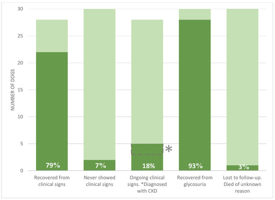 Clinical and para-clinical outcome of 30 dogs diagnosed with jerky induced Fanconi syndrome. Outcome of 30 dogs diagnosed with acquired Fanconi syndrome associated with ingestion of jerky treats. Dark color represents the number of dogs reported positive for the finding in question. The total height of each bar represents the total number of dogs for which the specific statement is relevant. The white numbers provide the percentage of positive findings. * Out of the 5 dogs reported to have continued clinical signs, 2 were diagnosed with chronic kidney disease (CKD) based on International Renal Interest Society guidelines.