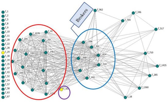 Figure 1 shows the dual-purpose farmer’s technological network in the reproduction area. The network consisted of 383 farmers, of which 91.12% were men and only 8.89% were women. To facilitate network visualization and interpretation, only farmers with an adoption rate higher than 57% in reproductive area were selected [46]. In the network, male farmers have been coloured green, while women have been coloured yellow. The network structure makes it possible to visualize how male and female farmers are interrelated. The network structure makes evident the existence of a core group composed of farmers f_1306, f_1501, f_824, f_510, f_442, f_175 and f_568.