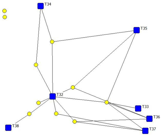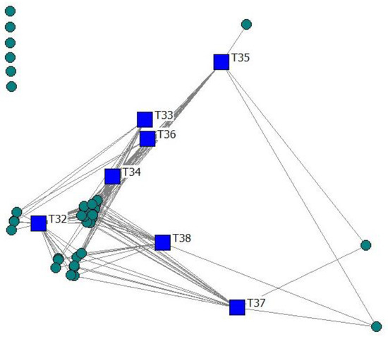 According to the significant differences found in centrality measures for the reproductive area, we deepened the SNA in this area. Reproductive technologies were identified by Rangel et al. [13] and García et al. [17] in very small dual-purpose bovine farms from the Mexican tropics. This area was composed of the following seven technologies oriented to improve reproductive efficiency parameters: breeding soundness evaluation in bulls (T32), semen fertility evaluation (T33), evaluation of female body condition (T34), oestrus detection (T35), pregnancy diagnosis (T36), type of mating (seasonal or continuous) (T37), and breeding policy (T38).