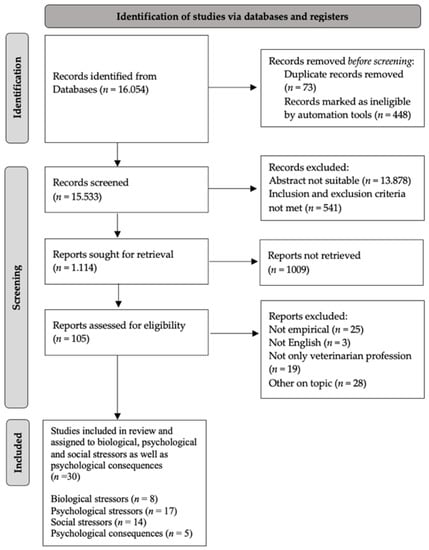 The literature search resulted in 16,054 citations. After excluding duplicates, records marked as ineligible by automation tools and studies not matching the inclusion criteria (publication in English; collection of empirical data on work-related stressors, stress and associated effects such as suicide or burnout (and connected synonyms) in veterinarian professionals; report findings regarding existing stressors and suicide rates among currently practicing veterinarians and articles published between 2012 and September 2022), the final selection resulted in 30 sources (see Figure 1). This selection was assigned to biological (n = 8), psychological (n = 17) and social stressors (n = 14) referring to the interconnection between biological, psychological and social–environmental factors in the context of human health (=bio-psycho-social model) []. In addition, a category dealing with psychological consequences of veterinary practice (n = 5) was added because some studies did not address stressors but rather the prevalence of mental disorders within this professional group. Overall, there was a total of 44 assignments in 30 studies, as some studies could be allocated to several categories.