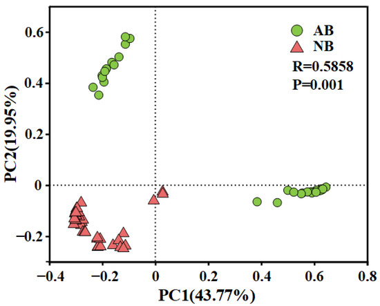 Sparse analysis showed that the sparse curve of the AB samples was close to saturation, while the NB samples did not tend to be flat (Figure S1), indicating that the AB samples were enough to complete the sequencing of most members of the bacterial community, while the NB samples were insufficient. The sequencing coverage of AB samples reached 99%, indicating that the sequencing depth was enough to cover most bacteria, including rare species, while the sequencing coverage of NB samples only reached 97% (Table 1). The phylogenetic diversity index (PD), species richness (Chao), and Shannon diversity index of the AB group were significantly lower than the NB group (p < 0.001) (Table 1). These results indicated that the diversity of the AB community was significantly lower than the NB community (p < 0.001). In addition, alpha diversity was not significantly different between summer (June to August) and autumn (September to November) in both AB and NB groups, and the Shannon diversity index was significantly lower in winter (December to February) than in both summer and autumn (p < 0.05, Table S1).