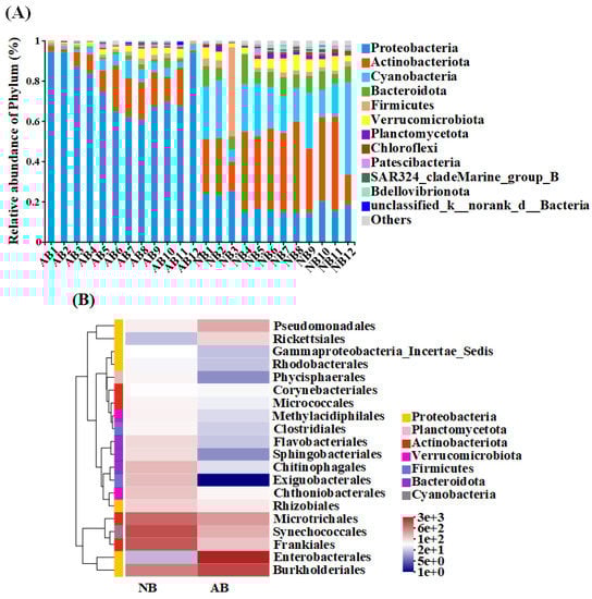 The AB community was mainly composed of Proteobacteria (76.67 ± 12.67%), Actinobacteriota (11.83 ± 7.27%), Cyanobacteria (4.05 ± 2.37%), Verrucomicrobiota (2.16 ± 1.48%), Firmicutes (1.44 ± 1.30%) and Bacteroidota (1.44 ± 0.69%) (Figure 2A). In the composition of the NB community, Actinobacteriota (33.94 ± 10.42%) had the highest relative abundance, followed by Cyanobacteria (22.38 ± 9.52%), Proteobacteria (18.08 ± 3.91%), Bacteroidota (8.24 ± 2.51%), Firmicutes (5.70 ±1 1.64%), Verrucomicrobiota (4.89 ± 1.83%), and so on (Figure 2A). Proteobacteria not only dominated the AB community but also the only taxa whose relative abundance was higher than that of the NB community (Figure 2A). Proteobacteria were mainly composed of Enterobacterales, Burkholderiales, Pseudomonadales, Rickettsiales, and Rhizobiales (Figure 2B). Actinobacteriota was the most important bacterial taxa of bacterioplankton, which was mainly composed of Microtrichales, and Frankiales (Figure 3). The relative abundance of Cyanobacteria was second among the AB and NB communities, which were mainly composed of Synechococcales (Figure 2B). Furthermore, in both groups AB and NB the relative abundance of Proteobacteria was higher in spring and winter than in summer and autumn, while Actinobacteriota and Cyanobacteria were lower in spring and winter than in summer and autumn (Figure S2).
