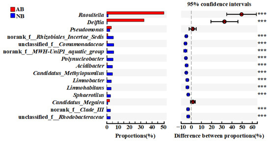 The community composition of the AB and NB groups was quite different, and Proteobacteria was the most significant taxa (Figure 2). After analyzing the differences of the top 15 genera (Student’s t-test) by the difference significance test between groups, it was found that there were significant differences in 13 genera (p < 0.05). Among the 13 genera with significant differences, only the relative abundance of Raoultella and Delftia was significantly higher in the AB group than in the NB group (Figure 3). The relative abundance of Pseudomonas and Candidatus_Megaira was also higher in the AB group.