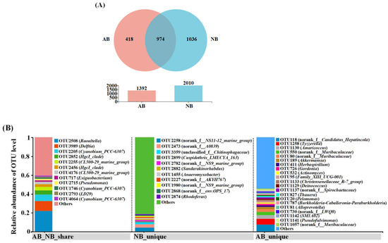The number of OTUs shared by the AB and NB communities was 974 (40.12%), while the number of unique OTUs was 418 (17.22%) and 1036 (42.67%), respectively (Figure 4A). At the same time, the NB community has more abundant OTUs, which further illustrates its higher alpha diversity. The shared OTUs were mainly composed of Raoultella (OTU2508), Delftia (OTU3989), Cyanobium PCC-6307 (OTU2205, 2255, and 4176), and the hgcI clade (OTU2852 and 2456) (Figure 4B). However, among shared OTUs, the distribution of species abundance in the AB and NB communities was not matched. For example, OTU2508 and OTU3989 were the only OTU in Raoultella and Delftia, respectively, and their relative abundance was the highest in the AB community but lower in the NB community (Figure 4). Among the unique OTUs of the AB community, Candidatus Hepatincola (OTU118) and Tyzzerella (OTU1258) were abundant (Figure 4B). Among the unique OTUs of the NB community, there was little difference between OTUs with relative abundance above 1% (Figure 4B). Surprisingly, the OTUs with a relative abundance of less than 1% were 54.66% in the unique OTUs of the AB community and as high as 81.64% in the NB community (Figure 4B).