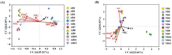 There are many environmental factors related to community distribution, but many of them have strong collinearity. Variance Inflation Factor (VIF) analysis was a commonly used method for screening environmental factors and computed as VIFj = 1/(1 − Rj2), Rj2 represents the proportion of variance of the jth independent variable related to other independent variables in the model [28]. In general, a VIF greater than 10 indicates that the regression model has severe multicollinearity. Through VIF variance expansion factor analysis, the environmental factors with VIF greater than 10 were screened and removed, and multiple screenings were performed until the VIF values corresponding to the selected environmental factors were all less than 10. Finally, the environmental factors associated with AB and NB communities were screened out as T, DO, pH, TN, TP, PO43−, NH4+, and NO3- (Table S2). After the DCA analysis, the CCA model was selected to analyze the correlation between bacterial communities and environmental factors. As shown in Figure 5, the two bacterial communities had different responses to environmental factors. The T, DO, pH, TP, PO43−, NH4+, and NO3− were significantly correlated with the variation of AB community, and all the selected parameters on the first two axes explained 39.55% of the bacterial community change (Figure 5A). The T, DO, TP, PO43− and NO3− were significantly correlated with the variation of the NB community, and all the selected parameters on the first two axes explained 39.69% of the bacterial community change (Figure 5B).