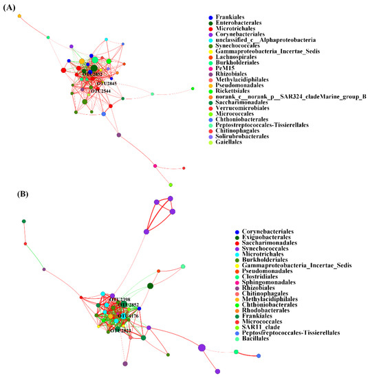 The OTU co-occurrence network of B. calyciflorus-associated bacterial and bacterioplankton communities. (A) B. calyciflorus-associated bacteria (AB); (B) bacterioplankton (NB). The nodes are colored according to order. Green edges represent positive correlations, and red edges represent negative correlations. Node size is proportional to the betweenness centrality of each OTU, and edge thickness is proportional to the weight of each correlation.