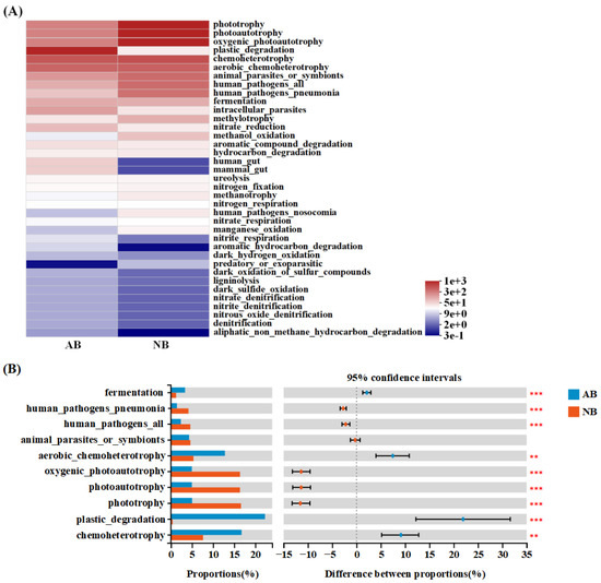Many microorganisms are involved in key biogeochemical processes and interspecific interactions. FAPROTAX function prediction is mainly used to further analyze the biogeochemical cycle function of microorganisms, especially the cycle function of sulfur, carbon, hydrogen, and nitrogen. Through FAPROTAX function prediction analysis (based on the Wilcoxon rank-sum test), 37 biogeochemical cycle functions were predicted from the AB and NB communities (Figure 7A). Although phototrophy, photoautotrophy, oxygenic photoautotrophy, and plastic degradation were the most common functions among the AB and NB communities, there were significant differences in functional abundance between the two bacterial communities (Figure 7). Among the most mainly biogeochemical functions of the AB community were plastic degradation, chemoheterotrophy, and aerobic chemoheterotrophy, while autotrophic functions, such as phototrophy, photoautotrophy, and oxygen photoautotrophy, were more prominent in the NB community. In addition, animal parasites or symbionts, human pathogens all, and human pathogen pneumonia were abundant in the NB community (Figure 7B).