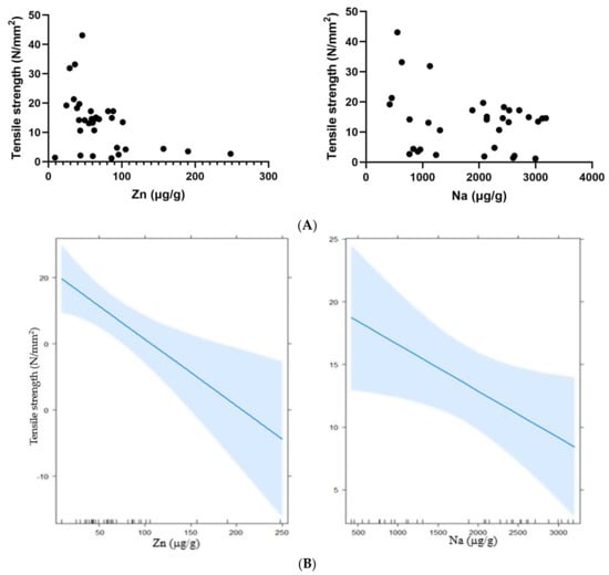 Linear relationship between the mineral elements Na and Zn with the hoof tensile strength. ((A) showing the observed values and (B) the values estimated by the model).