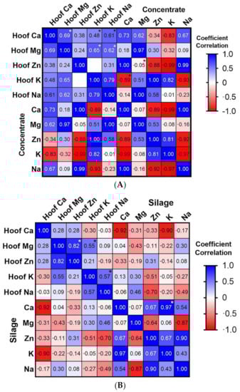Pearson correlation matrices between mineral elements (μg/mg) of the concentrate (A) and silage (B) with the horse hoof samples, respectively. * Indicates significant differences at p < 0.05.