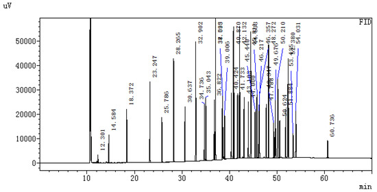 Three parallel samples were tested for the same sample, and the average value of the three samples was taken as the test result of the sample. Fatty acids were identified according to the relative retention times of fatty acid methyl ester standards. Using the peak of the standard sample (Figure 1) and comparisons with the sample peak diagram, a variety of fatty acids were compared, and the peak area normalization method was used to determine the relative percentage of each fatty acid, and finally the average percentage of each fatty acid. The ratio of PUFAs/SFAs to n-6/n-3 was calculated according to the composition and specific content of the measured fatty acids.
