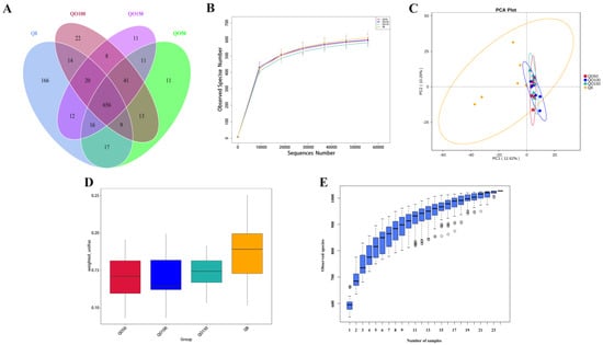 Analysis of cecal microbial diversity. Notes: (A) Operational taxonomic units−Venn (OTU−Venn) analysis; (B) Saturation curve of species number (dilution curve); (C) PCA analysis; (D) Anosim analysis; (E) Species accumulation box diagram.